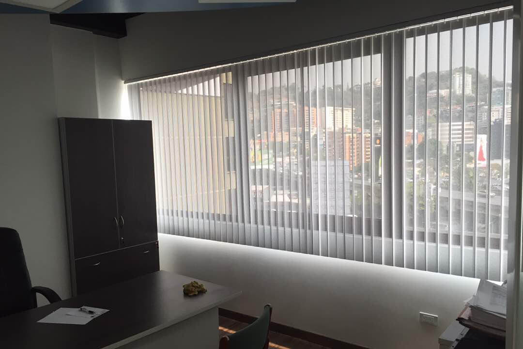 Among the most durable window coverings, vertical blinds are a popular choice for office spaces. Easy to clean and operate, they come in a variety of PVC models and colors.